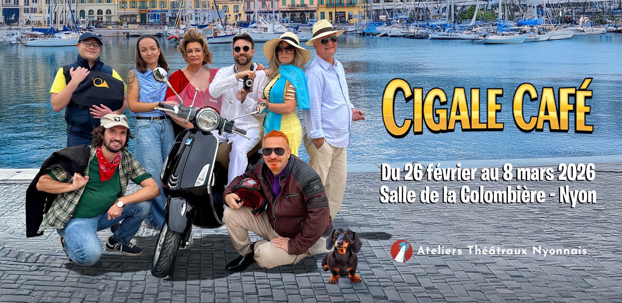 Après les succès de Salé ou sucré et Un canapé d’enfer, les Ateliers Théâtraux Nyonnais (ATN) présentent en 2026 leur nouvelle création : Cigale Café, une comédie en trois actes écrite et mise en scène par Anthony Berchten.