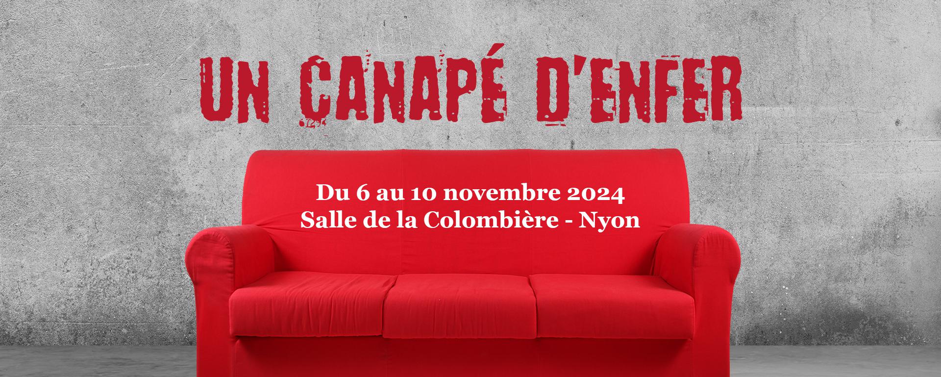 Du mercredi 6 au dimanche 10 novembre 2024, l'ATN vous donne rendez-vous à la Salle de la Colombière de Nyon pour y découvrir sa nouvelle création : Un canapé d'enfer. Cette comédie infernale est écrite et mise en scène par Anthony Berchten.